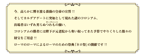 | Drop | QP(2000)、QP(3000)、QP(5000)、 種火(騎)、大火(騎)、騎の輝石、竜の牙、竜の逆鱗 ネロメダル(銅)*5、ネロメダル(銀)*2、ネロメダル(金)*2 |