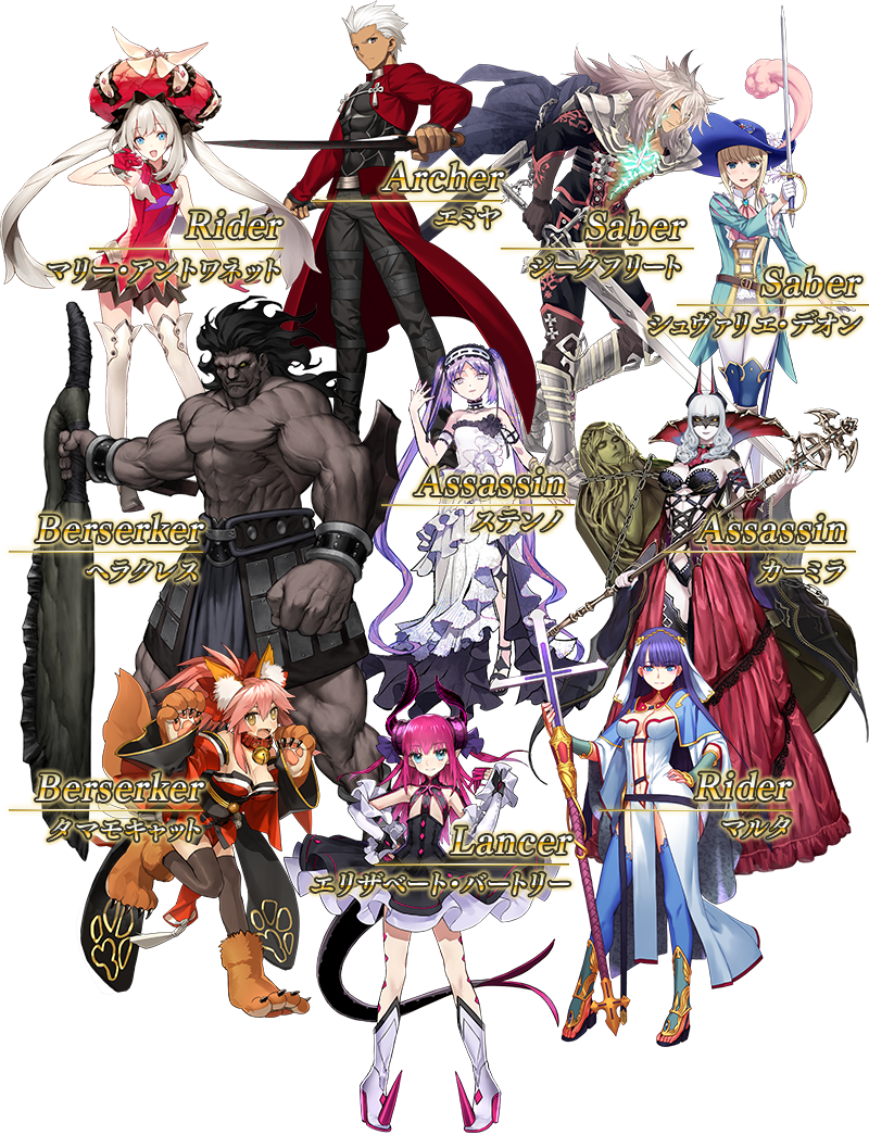 エミヤ、マリー・アントワネット、ジークフリート、シュヴァリエ・デオン、ヘラクレス、ステンノ、カーミラ、タマモキャット、エリザベート・バートリー、マルタ