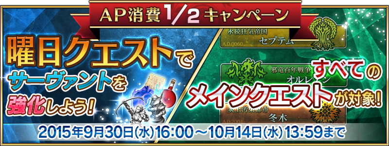 期間限定で、曜日クエスト(霊基再臨、スキル強化)のAP消費が1/2になります。